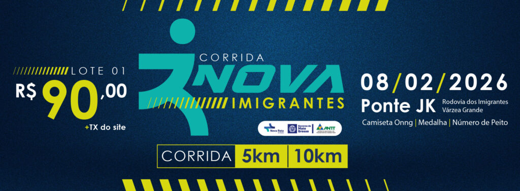 A Nova Rota do Oeste está com as inscrições abertas para a 1ª Corrida Nova Imigrantes, marcada para 8 de fevereiro de 2026, com largada e chegada na Rodovia dos Imigrantes (BR-070), próximo à Ponte JK, em Várzea Grande. O valor da inscrição é R$ 90 (primeiro lote).